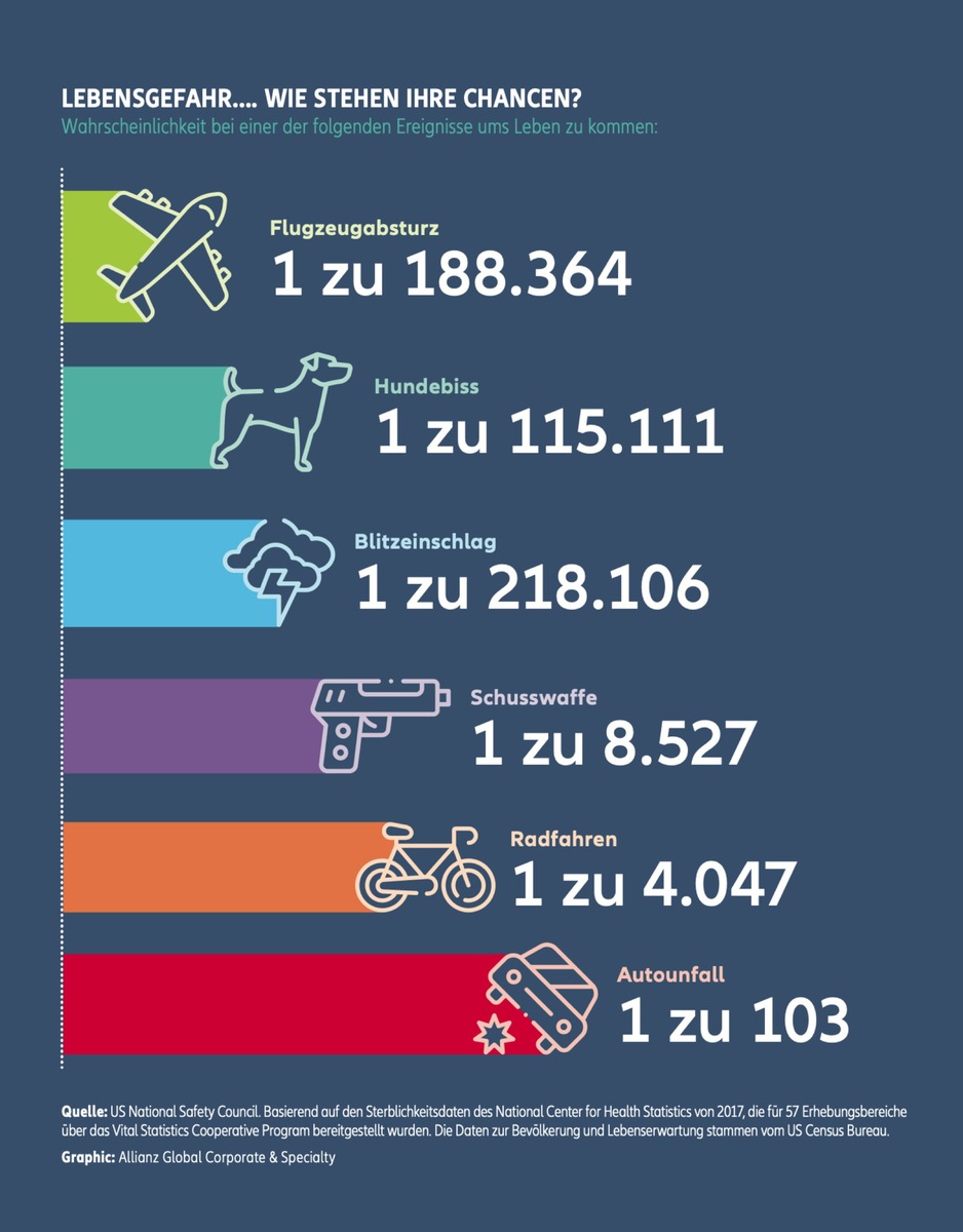 Drei der letzten vier Jahre waren die sichersten aller Zeiten. So gab es 2017 zum ersten Mal seit mindestens 60 Jahren in der Luftfahrt keine Todesopfer auf einem Passagierjetflug – es ist damit das sicherste Jahr überhaupt. Selbst 2018, wo es insgesamt 15 tödliche Flugzeugunfälle mit 556 Opfern gab, ist nach Statistiken des Aviation Safety Network das drittsicherste Jahr in der Geschichte des kommerziellen Flugverkehrs, 2015 belegt den zweiten Platz. Die Allianz-Studie bekräftigt, dass die Wahrscheinlichkeit, bei einem Flugzeugunglück zu sterben (1 zu 188.364), im Vergleich zu anderen Verkehrsmitteln wie Auto (1 zu 103) oder Fahrrad (1 zu 4.047) sowie anderen Szenarien wie versehentlicher Waffenentladung (1 zu 8.527) oder Hundeangriff (1 zu 115.111) äusserst unwahrscheinlich ist.