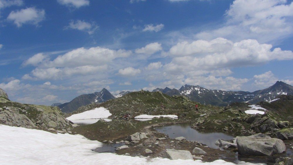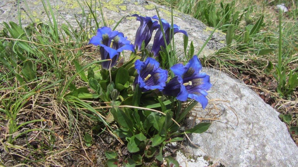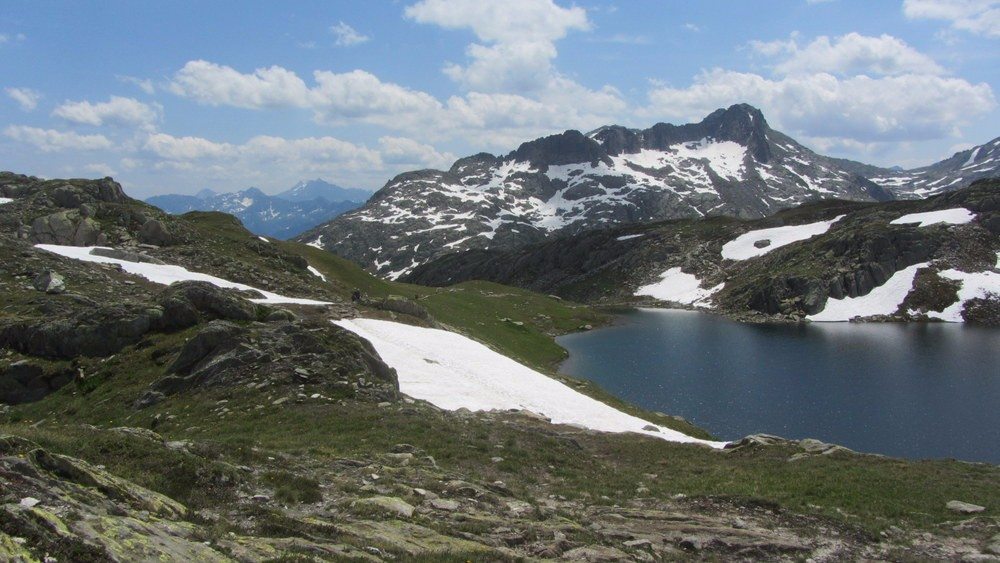 Die Hochebene Orsino begrüsste uns auf 2388 Metern mit dem ersten der insgesamt sechs Seen, kleinen Schneefeldern, tiefblauem Enzian, Alpenrosen, Arnika und Grauem Greiskraut. Es war eine Freude, in dieser Landschaft unterwegs zu sein! Die Wegspuren waren überall gut sichtbar, führten über das eine oder andere kleine Schneefeld, und bald sahen wir bereits die Laghi della Valletta.